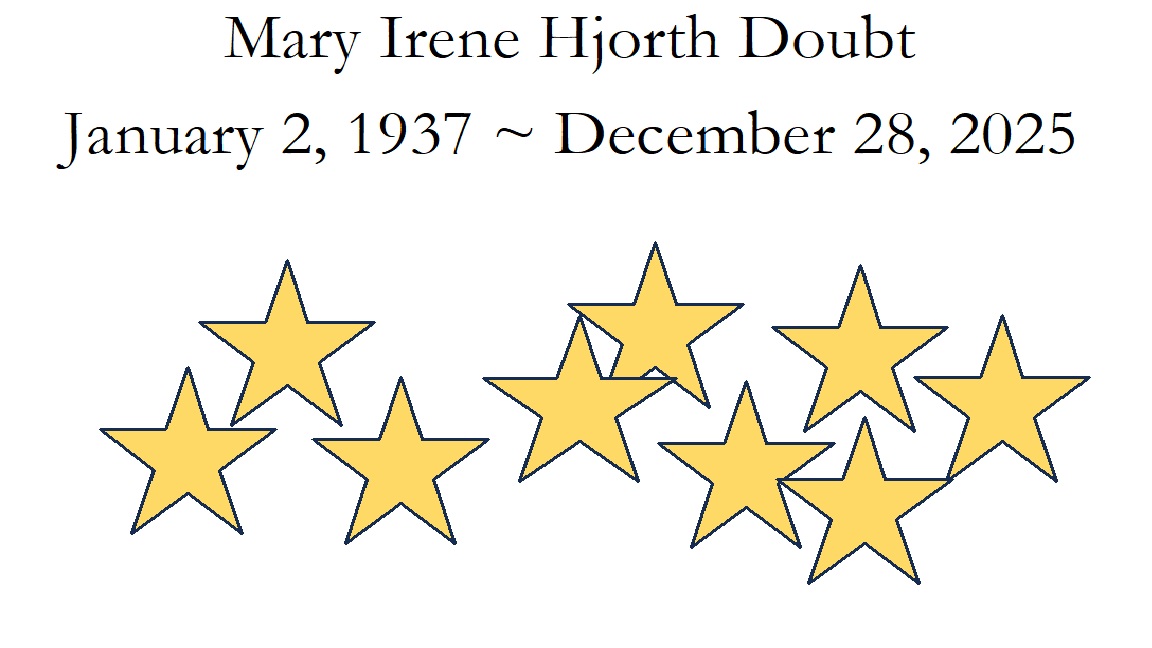 There will be no service at Mary’s explicit request. In due course her ashes will join that of her husband, Ronald Charles Doubt, in a spot along the Pend d’Oreille River which holds much joy and wonderful memories for all of the Doubt family. All who believe in the stars are welcome.